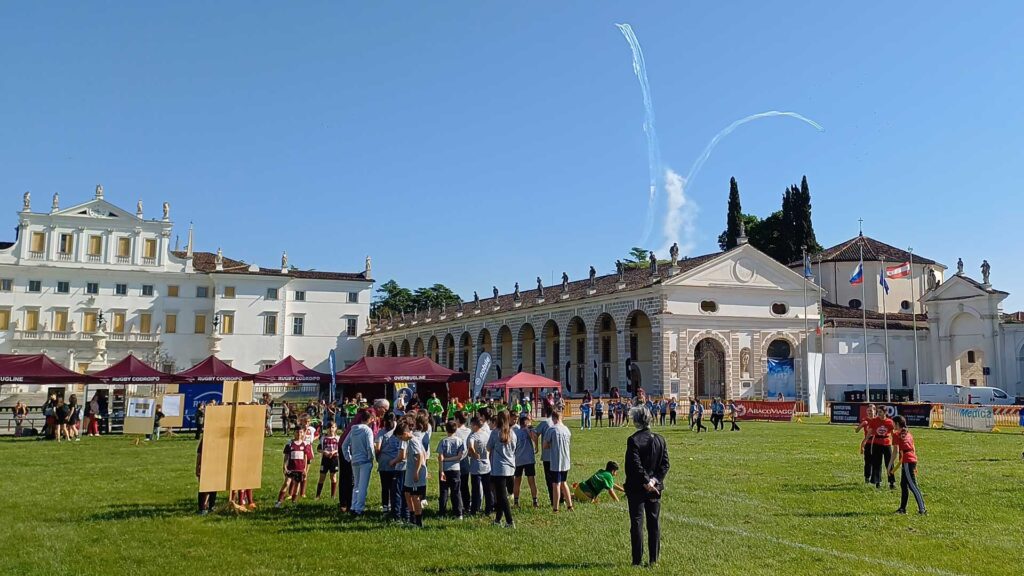 La ciliegina sulla splendida torta di questa giornata memorabile l’hanno realizzata le Frecce Tricolori, che avendo fatto il loro consueto allenamento sul cielo di Rivolto di Codroipo, erano ben visibili anche da tutti i presenti nel giardino di Villa Manin che, mentre aspettavano di iniziare gli incontri di Rugby Tag, sono rimasti qualche minuto col naso all’insù.