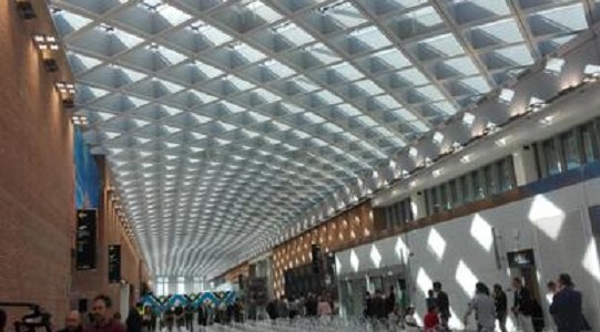 Destinato a confermarsi il terzo scalo intercontinentale italiano, l’aeroporto Marco Polo di Venezia da oggi mette a disposizione dei suoi passeggeri una nuova ala del terminal da 11.500 metri quadrati. E’ stato il ministro delle infrastrutture e trasporti Graziano Del Rio, unitamente ad Enrico Marchi, presidente del “Marco Polo”, ad inaugurare la nuova ala del terminal dello scalo aereo veneziano. Tra le autorità il sottosegretario all’economia, il sindaco di Venezia e il presidente dell’autorità portuale Venezia-Chioggia. L’area sarà a disposizione dei passeggeri da lunedì 19 giugno: l’intero terminal è di 78.800 mq. Questa struttura fa seguito ad altre migliorie, come la darsena e il moving walkway. Il terminal è caratterizzato dall’architettura della copertura metallica a pianta trapezoidale realizzata in acciaio e vetro (foto). L’opera è costata 68,6 milioni di euro e rientra tra le opere previste nel piano investimenti per gli anni 2012-2021.