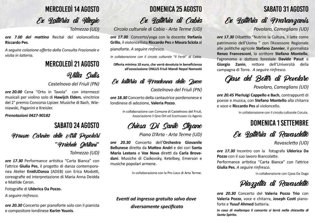 Nelle suggestive latterie  friulane più antiche come Illegio, Cabia, Maranzanis e Ravascletto prendono parte al Festival artisti di fama nazionale e internazionale. Tra essi, il compositore e pianista svizzero-palestinese Karim Younis, il trio londinese che unisce Valeria Pozzo alla chitarra e voce, Joseph Costa al pianoforte e Yusuf Ahmed alle percussioni, l’Orchestra Giovanile Bellunese, il collettivo di danza contemporanea EnidUDanza e l’attrice Giulia Pes.