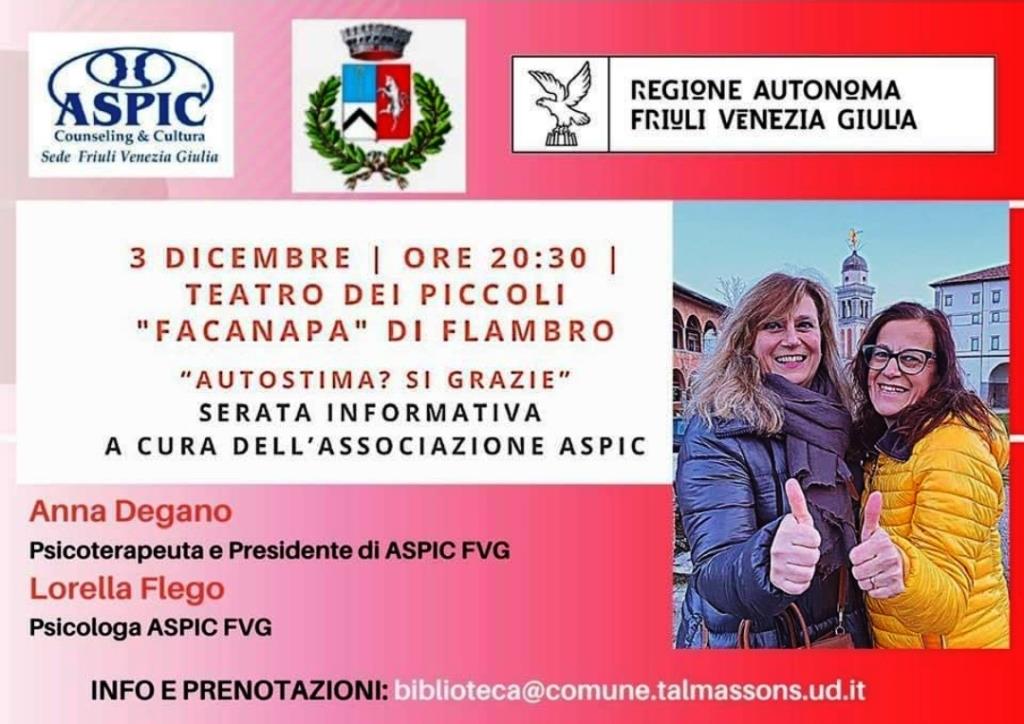Ma le iniziative nel Medio Friuli non finiscono ancora: i prossimi eventi a Talmassons (UD) per il contrasto alla violenza sulle donne sono il 3 dicembre ore 20:30 al “Teatro dei Piccoli” di Flambro dove sarà presentata la serata informativa “Autostima? Sì grazie!” a cura dell’Associazione Aspic con la Dott.ssa Anna Degano e Lorella Flego.