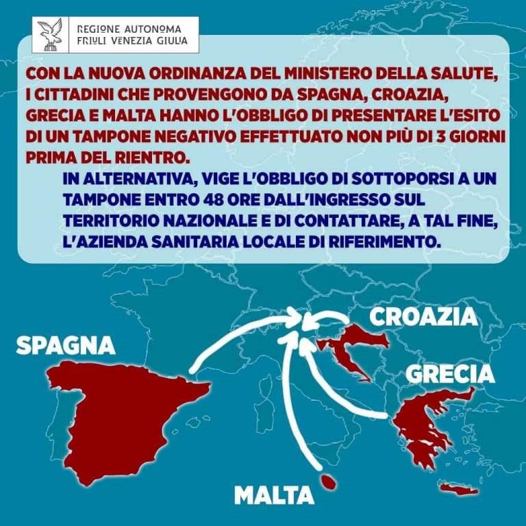 A partire dal 13 agosto coloro che fanno ingresso in Italia, con qualsiasi mezzo di trasporto, dopo aver soggiornato o transitato nei quattordici giorni antecedenti in Croazia, Grecia, Malta e Spagna, devono comunicare immediatamente il proprio ingresso nel territorio nazionale al Dipartimento di Prevenzione dell’Azienda Sanitaria di residenza/dimora.