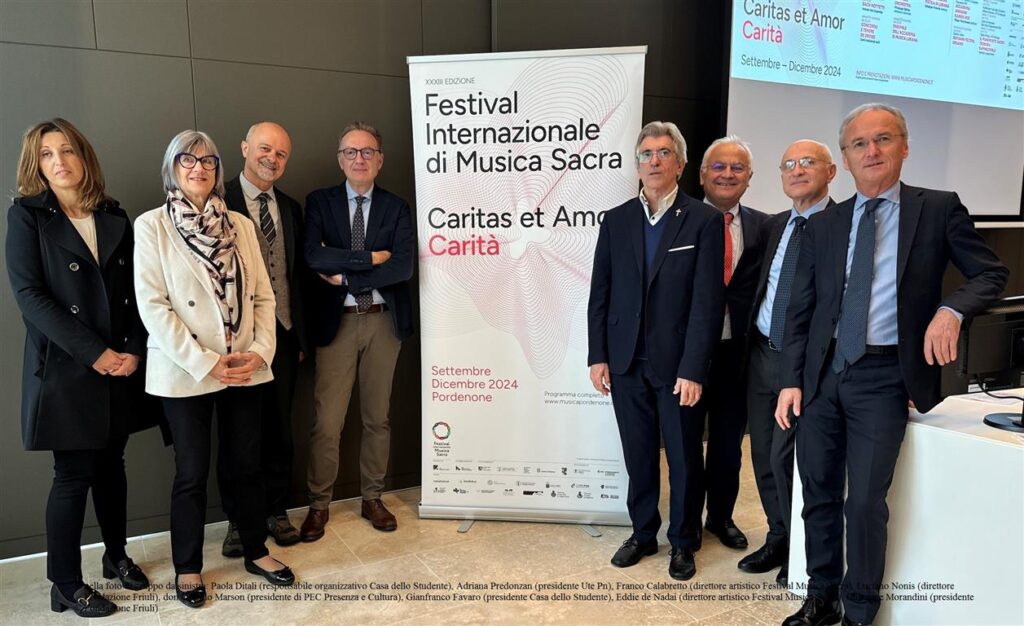 PORDENONE – Con un cartellone che spazia dal canto Gregoriano e dal Medioevo di Hildegard von Bingen, dal Rinascimento corale e dal Barocco orchestrale fino alle composizioni dei nostri giorni, e con 11 concerti a Pordenone, 6 eventi musicali a Udine, Codroipo, San Vito al Tagliamento, Sacile e Maniago, 3 mostre originali e 3 conferenze dedicate ad altrettante produzioni in programma, taglia il traguardo della sua 33^ edizione il Festival Internazionale di Musica Sacra, di scena dal 20 ottobre al 14 dicembre 2024, per la direzione artistica dei maestri Franco Calabretto e Eddi De Nadai, promosso da Presenza e Cultura con il Centro Iniziative Culturali Pordenone, in sinergia con il Ministero della Cultura, la Regione autonoma Friuli Venezia Giulia e il Comune di Pordenone, con il sostegno di Fondazione Friuli e BCC Pordenonese e Monsile.