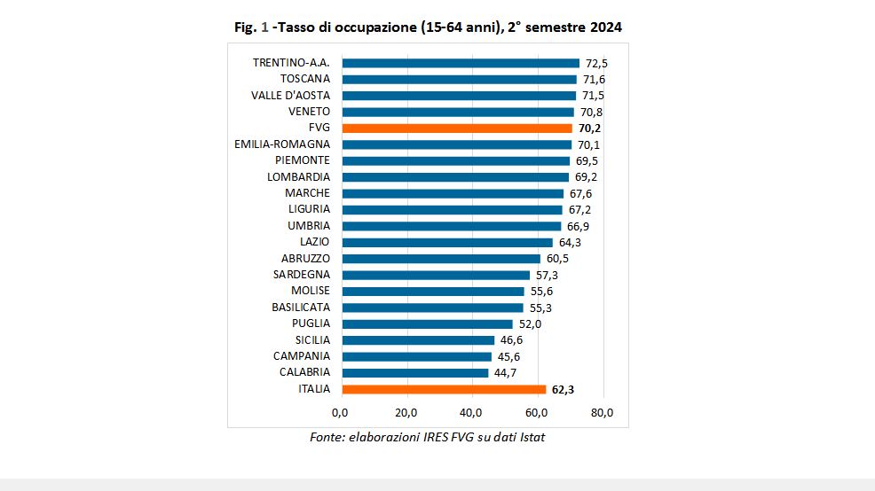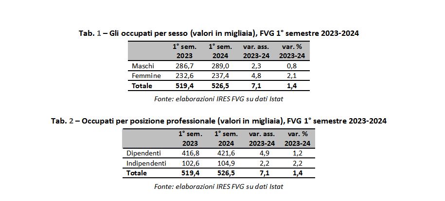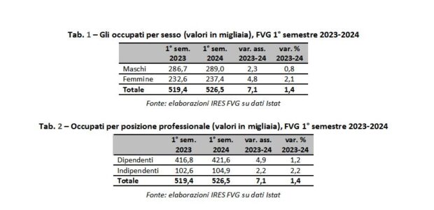 Nel primo semestre 2024 il numero di occupati stimato dall’Istat è pari in media a 526.500 unità, 7.100 in più rispetto allo stesso periodo dell’anno scorso (+1,4%). Lo rende noto il ricercatore dell’Ires Fvg Alessandro Russo. La crescita osservata, spiega Russo, ha riguardato in misura maggiore la componente femminile (+2,1%, pari a +4.800 unità su base annua). Per quanto riguarda i settori, i risultati positivi delle costruzioni (+2.400 occupati) e soprattutto dei servizi (+9.400) hanno compensato il calo registrato nell’industria (-4.200 unità). Il tasso di occupazione regionale (calcolato nella fascia di età compresa tra 15 e 64 anni) nel secondo trimestre di quest’anno ha superato il 70% (70,2%), mantenendo un significativo divario di genere: 75,8% per i maschi contro il 64,5% delle femmine.