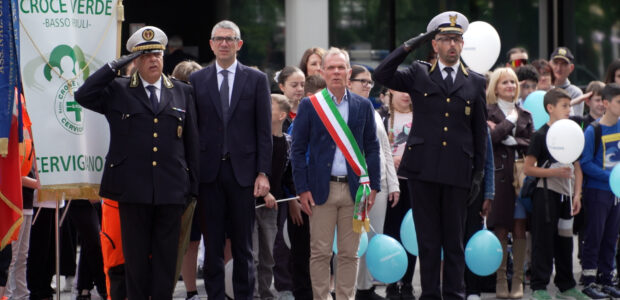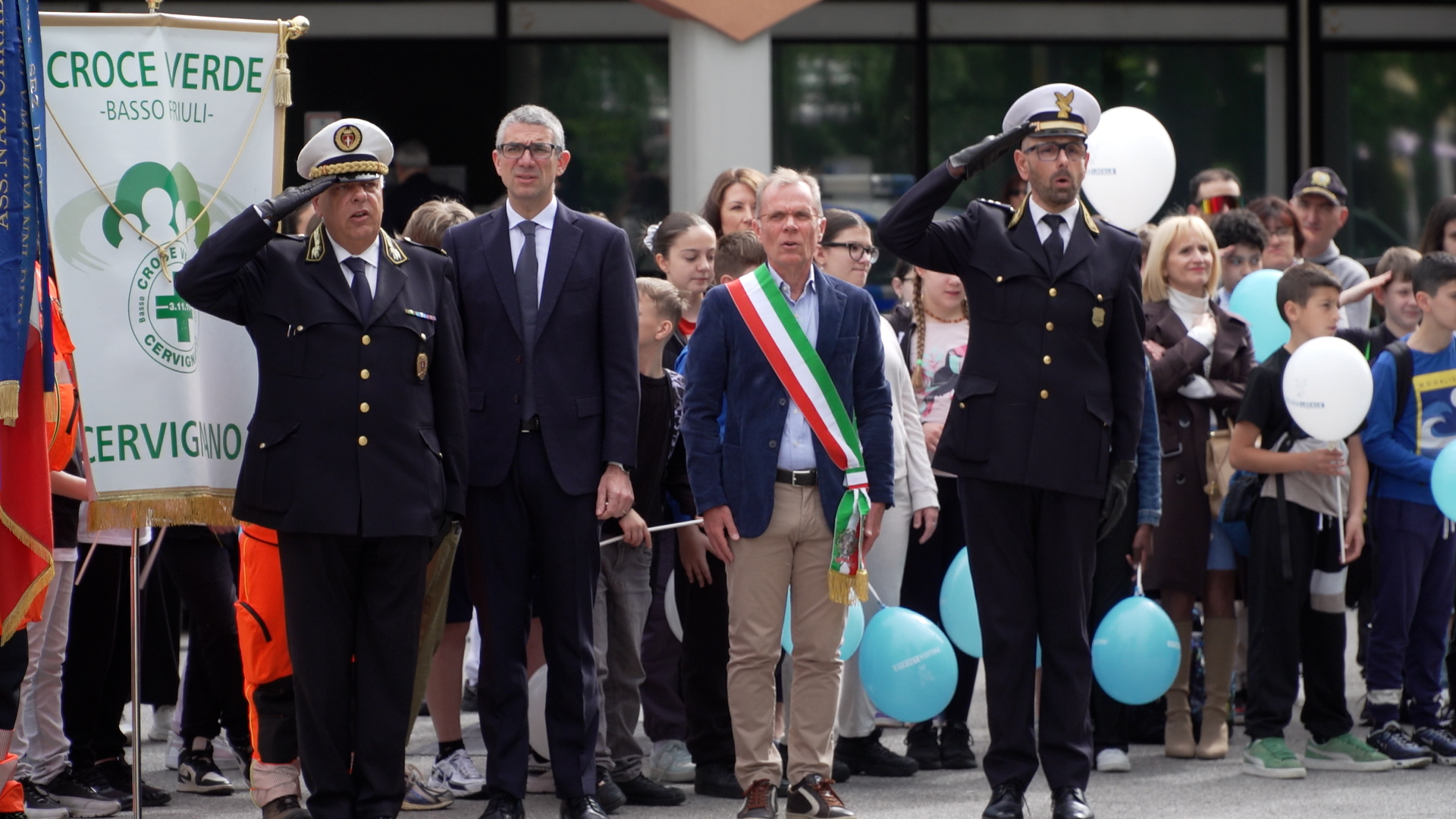 La cerimonia è iniziata alle 9 in piazza Indipendenza con lo schieramento degli agenti di Polizia locale per la rassegna delle autorità, la benedizione da parte del parroco di Cervignano don Sinuhe Marotta e la sfilata lungo le vie del centro cittadino. In testa al corteo, con i gonfaloni della Regione e del Comune ospitante, hanno sfilato, tra gli altri, l’assessore regionale Roberti e il sindaco di Cervignano Andrea Balducci nonchè i primi cittadini di molti Comuni della regione. Il comandante della Polizia locale di Grado Mario Bressan ha fatto da maestro di cerimonia, affiancato dal dirigente generale del Corpo di Polizia locale di Trieste Walter Milocchi e dal comandante della Polizia locale del Cervignanese Federico Ferrazzo.