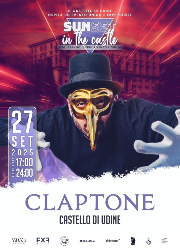 A far ballare il pubblico all’ora del tramonto sarà il dj tedesco Claptone, artista mascherato e misterioso salito alla ribalta nel 2013 e capace di conquistare i palchi dei principali festival mondiali, tra cui i celebri Tomorrowland e Coachella. Importantissime le novità di questa edizione, a cominciare dal periodo di svolgimento, che si colloca non a inizio giugno come in passato, ma a fine settembre, per la precisione sabato 27 settembre (dalle 17.00), caratterizzandosi come happening di chiusura della stagione dei grandi live estivi del Friuli Venezia Giulia. Nuova sarà anche la venue che, grazie alla diponibilità del Comune di Udine, si sposta nel piazzale del Castello, luogo simbolo degli eventi di qualità della città. Confermatissimo è invece il format dell’evento, che unisce musica, eleganza e grande gastronomia. Dalle 17.00 alle 21.00 il pubblico potrà infatti degustare i vini di quattro cantine del Friuli Venezia Giulia, abbinate a quattro proposte gastronomiche. Diverse saranno inoltre le proposte artistiche che si affiancheranno al main artist e che verranno annunciate nei prossimi giorni. biglietti per la quinta edizione di Sunset in the Castle – Degustando il FVG, organizzato da Pro Majano, in collaborazione con PromoTurismo FVG e Comune di Udine, saranno di due tipologie, a 45 Euro e 55 Euro (entrambi più diritti di prevendita), a seconda del numero di degustazioni prescelto e saranno in vendita dalle 11.00 di martedì 24 giungo sui circuiti Ticketone e Ticketsms. Info su www.promajano.it. Per prenotazioni è possibile contattare anche i numeri: +39 348 0165383 e +39 3490587353