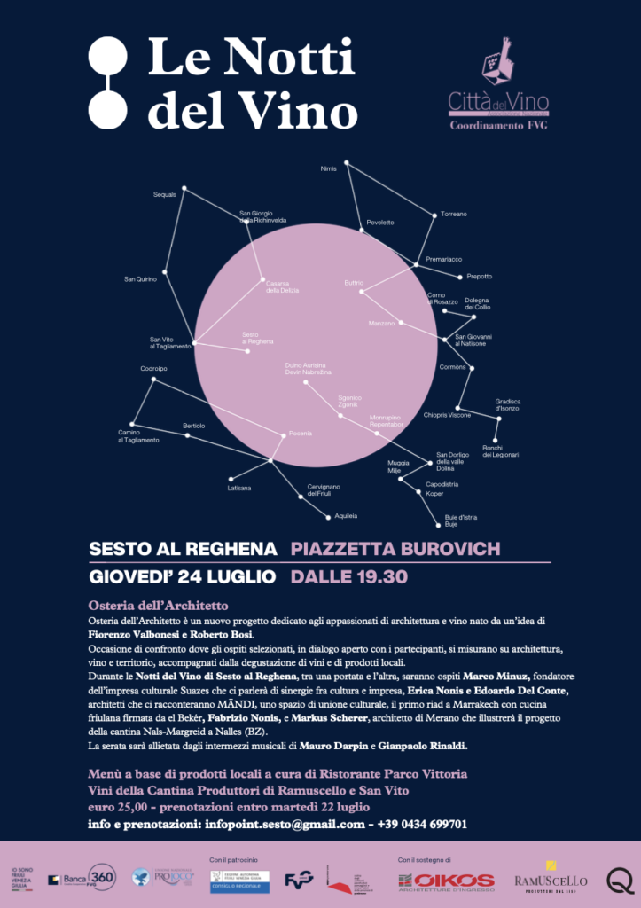 Qui dalle ore 19.30 ci sarà la possibilità di partecipare all’Osteria dell’Architetto, un nuovo progetto dedicato agli appassionati di architettura e vino nato da un’idea di Fiorenzo Valbonesi e Roberto Bosi. Occasione di confronto dove gli ospiti selezionati, in dialogo aperto con i partecipanti, si misureranno su architettura, vino e territorio, accompagnati dalla degustazione di vini e di prodotti locali. Durante le Notti del Vino di Sesto al Reghena, tra una portata e l’altra a cura del ristorante Parco Vittoria, si alterneranno personalità della cultura, del design e del paesaggio, accompagnati da momenti musicali dal vivo. Saranno ospiti Marco Minuz, fondatore dell’impresa culturale Suazes che parlerà di sinergie fra cultura e impresa, Erica Nonis e Edoardo Del Conte, architetti che ci racconteranno MĀNDI, uno spazio di unione culturale, il primo riad a Marrakech con cucina friulana firmata da el Bekér Fabrizio Nonis, e Markus Scherer, architetto di Merano che illustrerà il progetto della cantina Nals-Margreid a Nalles (BZ).