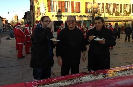 E’ il dolce dei record quello confezionato a Palmanova dai pasticceri della citta’ stellata in collaborazione con i maestri dolciari di Etica del Gusto: un tronchetto di Natale di 400 metri attorno all’anello di Piazza Grande che ha cominciato a prendere forma attorno alle 10 di mattina ed è stato completato alle 16:00 quando il taglio della prima fetta ha dato il via alla distribuzione di 8000 porzioni di torta a famiglie e bambini accorsi in pipazza per dare spazio alla golosita’.