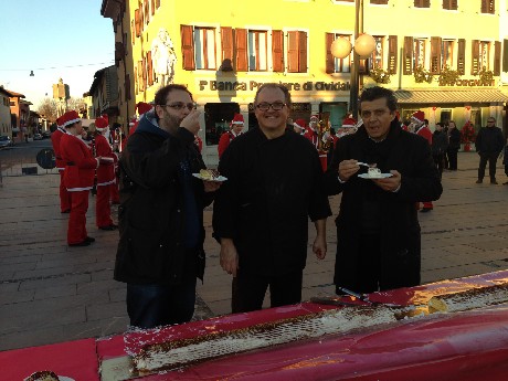 Al taglio della prima fetta erano presenti il sindaco Francesco Martines, l’assessore al commercio Massimo Agnese il presidente dell’Associazione Attività Economiche di Palmanova, Claudio Cedrone, che ha ideato e coordinato l’iniziativa e Renato Talotti, coordinatore dei pasticceri della città stellata. La festa è stata accompagnata dalle note della Banda Cittadina di Palmanova, per l’occasione composta da tanti musicisti Babbo Natale e dalla musica dei cartoni animati anni 80 e 90 suonata dal gruppo Cartoni Ardenti