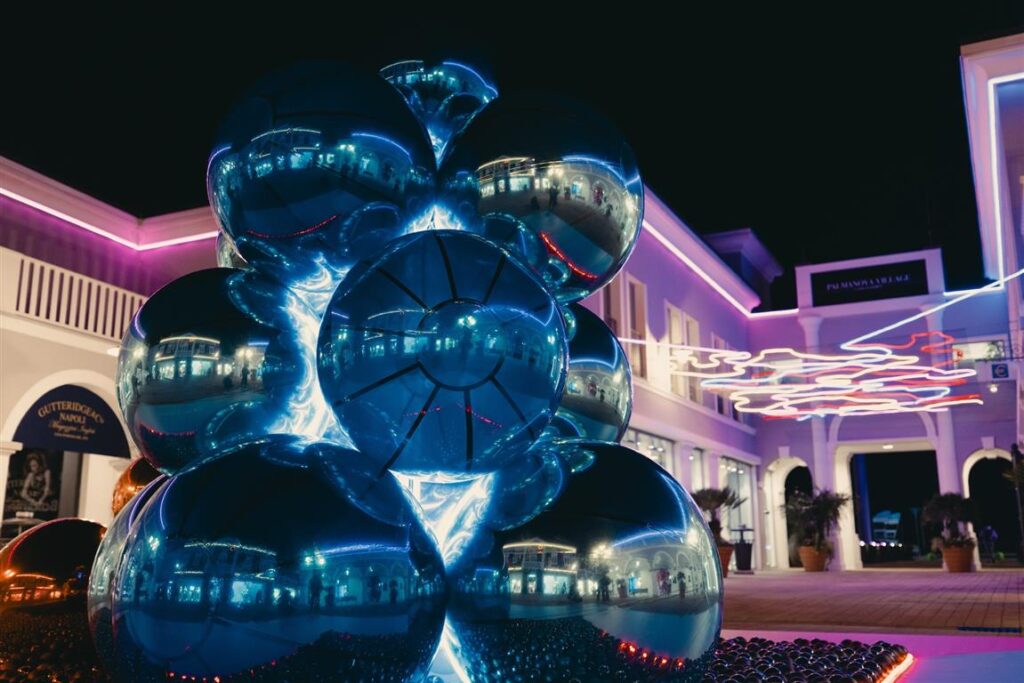 Strisce di luci al neon incorniciano le facciate degli ingressi, gli alberi, le siepi e alcuni edifici nelle vie interne del Villaggio, mentre l’area della fontana è ricoperta da un manto di palline colorate con al centro un grande albero composto da sfere colorate giganti di diverse dimensioni.