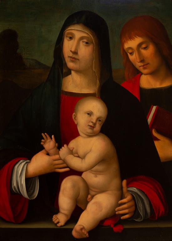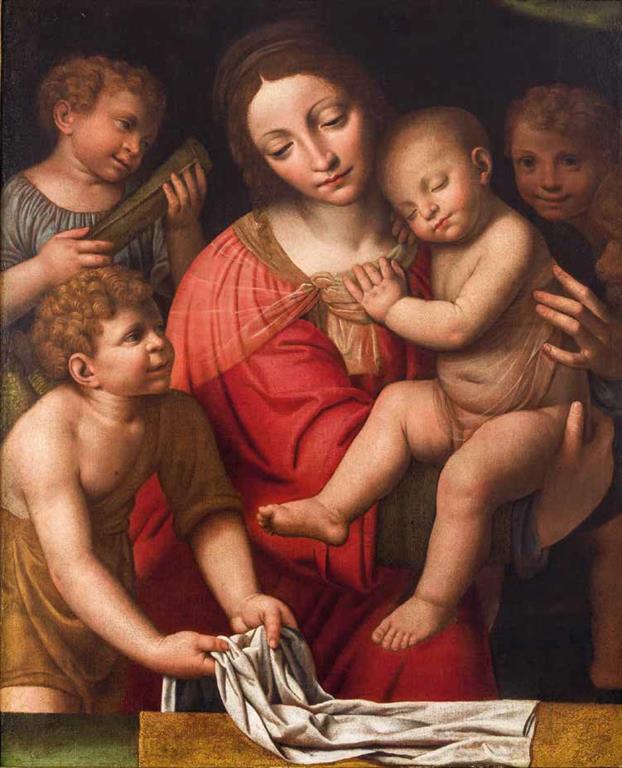 Tra le opere esposte si può riconoscere, come veri gioielli di altissimo pregio, la Sacra Conversazione di Palma il Vecchio, del secondo decennio del Cinquecento, la Madonna col Bambino di Lazzaro Bastiani, di fine Quattrocento, la Madonna col Bambino di Giovanni Bellini e collaboratori, del primo Cinquecento, la stupenda tavola dedicata a Il Sonno del Bambino Gesù in braccio a sua Madre, opera del 1525 realizzata da Berardino Luini, genio lombardo tra i più straordinari seguaci di Leonardo da Vinci; ma anche la tavola con la Madonna e il Bambino tra due santi del Giampietrino, del 1523 circa, o la tavola cuspidata di Antoniazzo Romano con la Madonna e il Bambino, del primo Cinquecento, o lo spettacolare trittico fiammingo con l’Adorazione dei Magi, ascrivibile al cosiddetto “Maestro del fogliame ricamato”, attivo tra Bruges e Brussels a fine Quattrocento. E grandi capolavori sono pure le due opere che stanno agli estremi cronologici della mostra, la grande tavola lignea duecentesca abruzzese con la Madonna lactans, da una parte, e la scultura del volto della Vergine di Adolfo Wildt, del 1924, in marmo spiritualissimo, dall’altra.