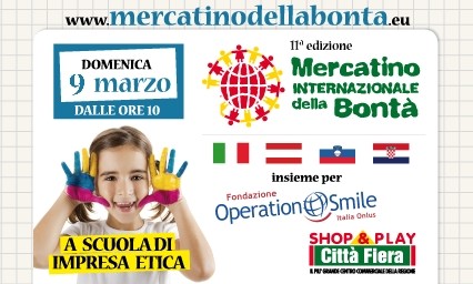 Domenica nelle gallerie del Centro Commerciale Citta’ Fiera si terra’ l’XI edizione del Mercatino Internazionale della Bonta’ – A Scuola di Impresa Etica che nasce sotto il segno di “Accendi il mio Sorriso”. Vista la finalita’ sociale del progetto a favore di Operation Smile ONLUS, gli organizzatori rivolgono alle famiglie ed agli insegnanti un caloroso invito a partecipare all’appuntamento dedicato ai bambini ed ai ragazzi delle scuole di ogni ordine e grado di Italia, Slovenia, Croazia ed Austria (al momento hanno aderito già 25 scuole e 5 famiglie per un totale di oltre 900 bambini). L’evento gode per la prima volta del patrocinio di Regione Fvg e di numerosi enti locali e realta’ territoriali. Il progetto invita i bambini grandi e piccoli alla vendita dei propri giocattoli per avvicinarli all’imprenditoria legando gli aspetti solidali attraverso la donazione di una parte del ricavato a un’iniziativa benefica. Grazie all’attiva partecipazione dei ragazzi a questo progetto educativo e solidale e ai tanti sostenitori, negli ultimi tre anni sono stati operati ben 52 bambini affetti dal cosiddetto “labbro leporino”. La Missione scelta per devolvere l’incasso dell’edizione 2014 del Mercatino Internazionale della Bonta’ è “Un Mare di Sorrisi” , il progetto umanitario della Fondazione Operation Smile in collaborazione con la Marina Militare Italiana, sbarcato in Africa, a bordo della portaerei Cavour. Sarà proprio la portaerei Cavour a dare accoglienza ai piccoli pazienti e ai loro familiari.