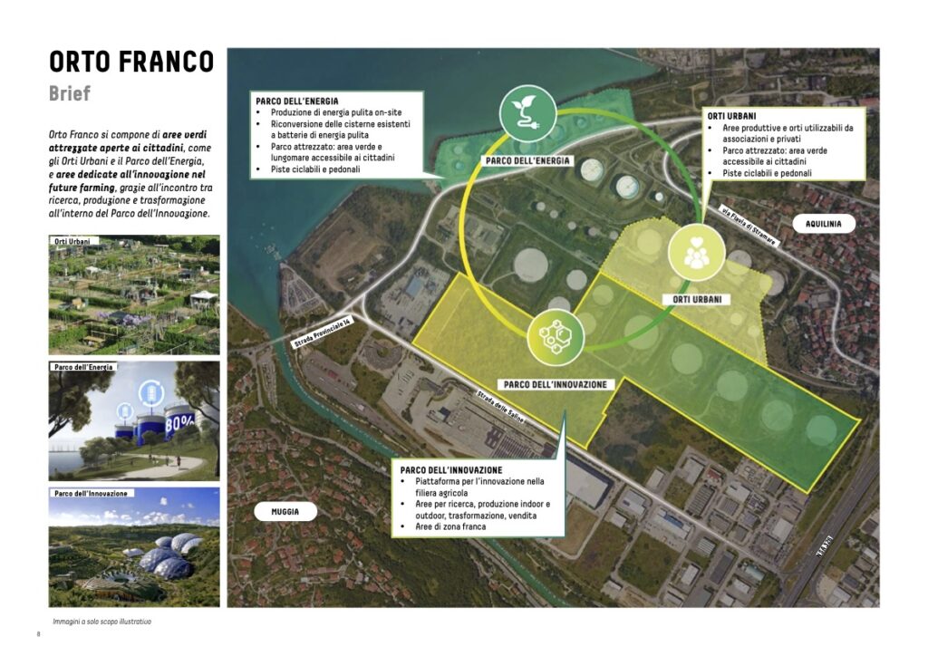 Guardando nel dettaglio, il terreno del progetto collocata tra Muggia e Aquilinia, si svilupperà su una superficie di 31,3 ettari. Tre saranno le destinazioni d’uso principali secondo il progetto di studio concepito in collaborazione con CRA – Carlo Ratti Associati: il parco dell’innovazione con l’area di zona franca, una vera e propria piattaforma per l’innovazione nella filiera agricola; il parco dell’energia con la produzione di energia pulita on-site attraverso la riconversione delle vecchie cisterne esistenti a batterie di energia pulita; infine la zona degli orti urbani con aree produttive ed orti utilizzabili da associazioni e privati. Oltre a piste ciclabili e pedonali che di fatto permetteranno l’apertura ai cittadini di zone da sempre destinate a imprese industriali (dunque interdette al pubblico)