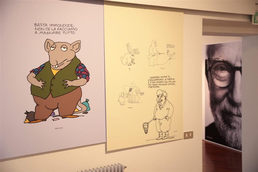 La mostra consentirà anche la visione d’una grande raccolta di vignette-bestiario comprendenti anche il genere umano: qui gli “omini”, esseri sia femminili che maschili, tranne rare eccezioni, non fanno una “bella figura” al contrario dei bambini, che sono saggi, preoccupati per la sorte della natura e pongono domande sensate, a volte spiazzanti. Per contro, dagli adulti, ricevono risposte ciniche e ottuse.
