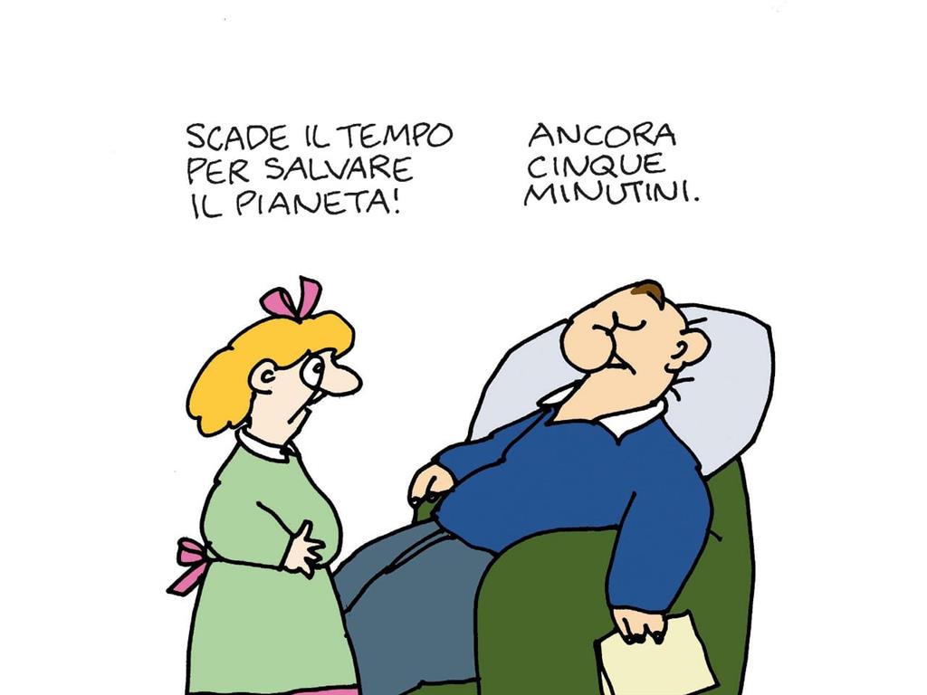 Sorprendente per mole e varietà, l’esposizione è divisa in due sezioni e ha come tema centrale la salute del nostro pianeta. Le vignette esposte nella prima parte sono infatti una raccolta dei molti pensieri, oltre 200, del vignettista riguardanti la terra e gli esseri che la abitano come noi umani, sia maschi che femmine, adulti e bambini. Questi ultimi nei suoi disegni sanno spesso essere tanto saggi – preoccupati per la sorte della natura e pongono domande sensate, a volte spiazzanti, ricevendo, purtroppo, dagli adulti risposte ciniche e ottuse – quanto canaglie, frutto della società.