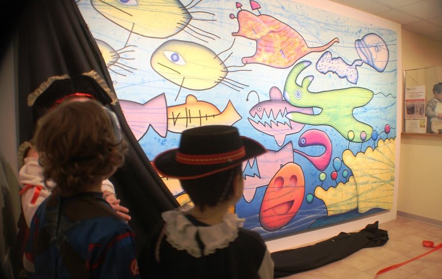 La componente che traspare da tutto il personale impegnato all’interno è il grande amore profuso, componente essenziale unitamente alle terapie e ricambiato da tutti i piccoli pazienti che affrontano le loro sofferenze in un ambiente pregno di calore umano. Questo ha acceso la grande sensibilità anche di Gianni Maran che è riuscito a inaugurare la sua opera durante il carnevale, così il taglio del nastro è avvenuto a cura di Zorro con la collaborazione di Capitan America e Re Artù (spero di non sbagliare, ma comunque un nobile con la corona), coadiuvati da una piratessa un po’ cresciuta. Contemporaneamente dei mini Bruno Barbieri (riconosciuto dagli occhiali) abbigliato da chef, tagliò il filo che teneva il drappo davanti all’opera, scoprendola.