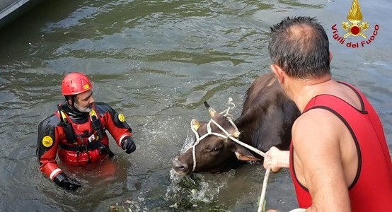 Operazione di salvataggio molto particolare quella attuata dai vigili del fuoco di Vicenza. Una mucca era scivolata nelle acque del fiume Bacchiglione nei pressi di Casale, a Vicenza, rischiava di annegare perchè le sponde del corso d’acqua erano troppo scoscese e il povero animale non riusciva a raggiungere il campo sovrastante. Intervenuti con la squadra nautica e i sommozzatori, i pompieri hanno raggiunto e legato ad una corda l’animale appena in tempo, fino a farlo raggiungere una sponda più accessibile; qui la mucca è stata imbragata e con l’aiuto di un trattore tirata delicatamente sull’argine. L’animale superato lo stress è apparso in buone condizione e ha raggiunto da sola la vicina stalla.